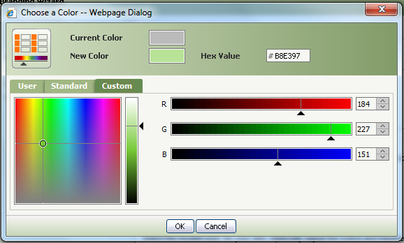 A desktop-quality modal dialog with interactive RGB sliders, HSL picker, and hex value entry.
