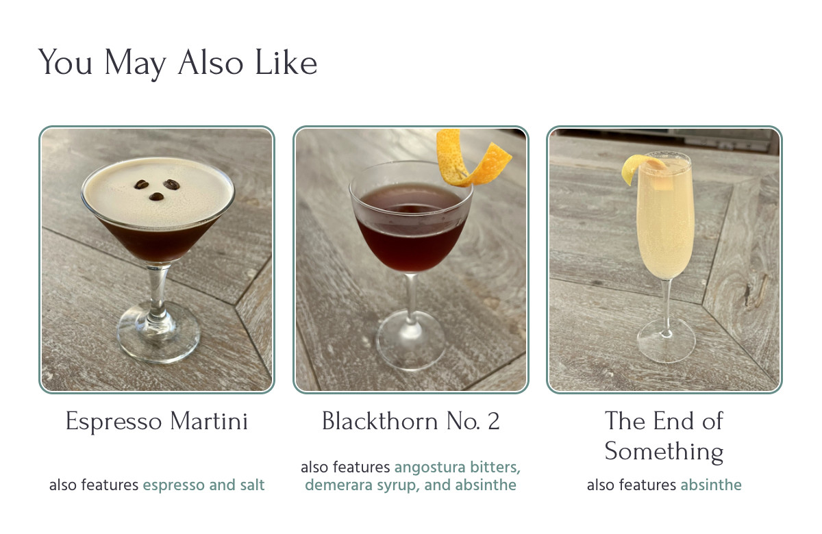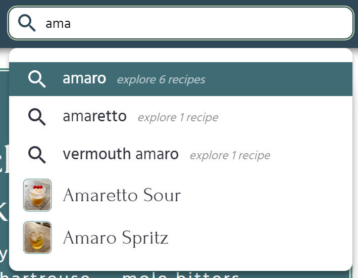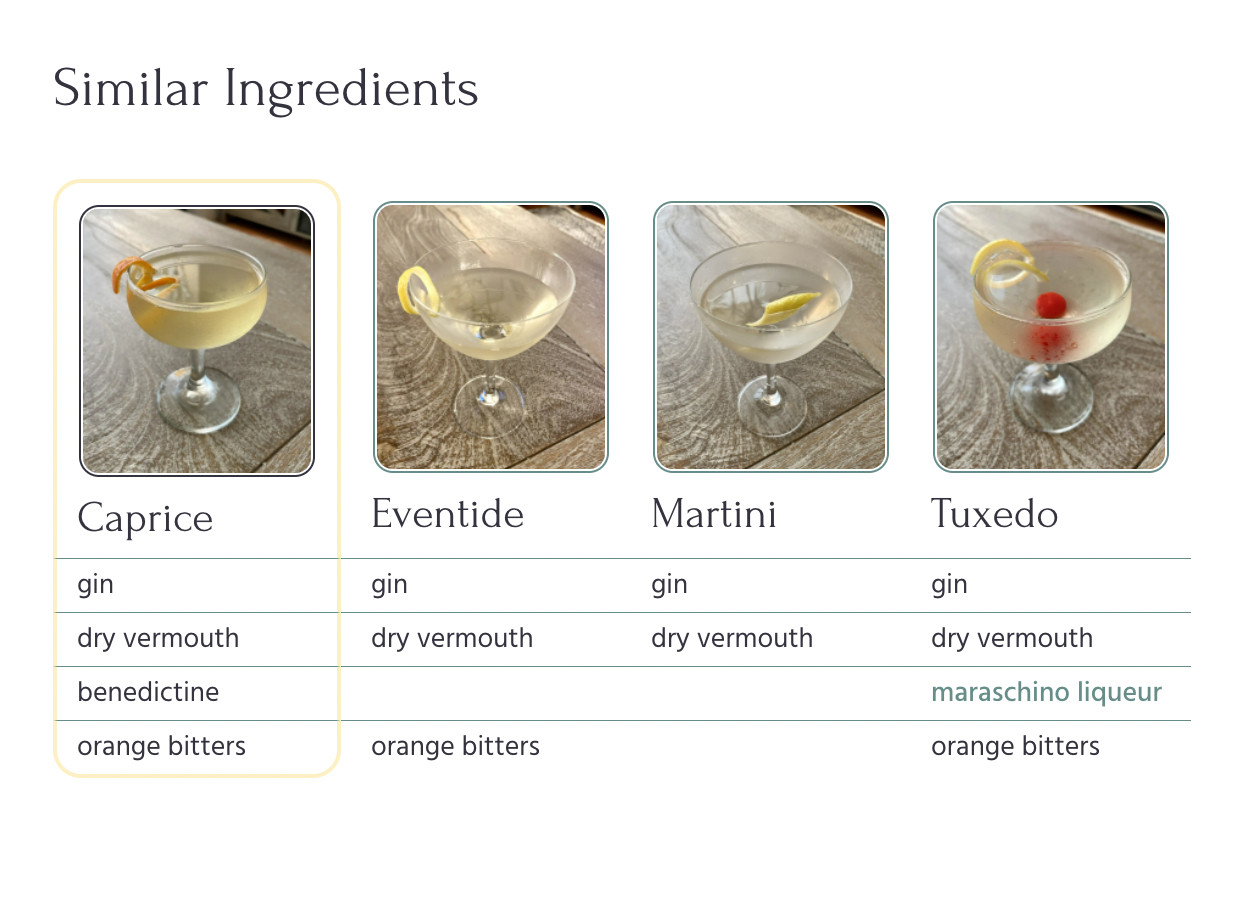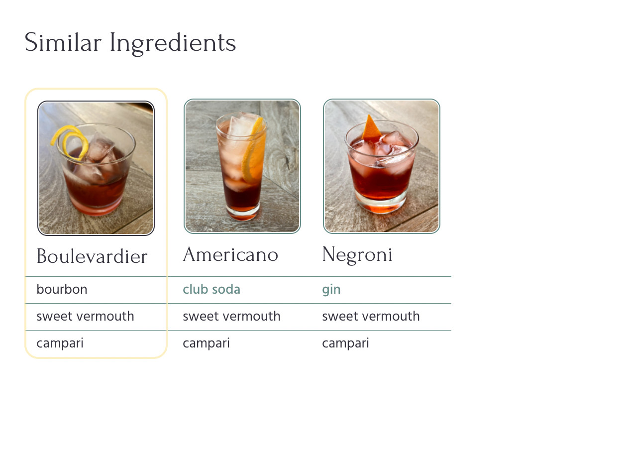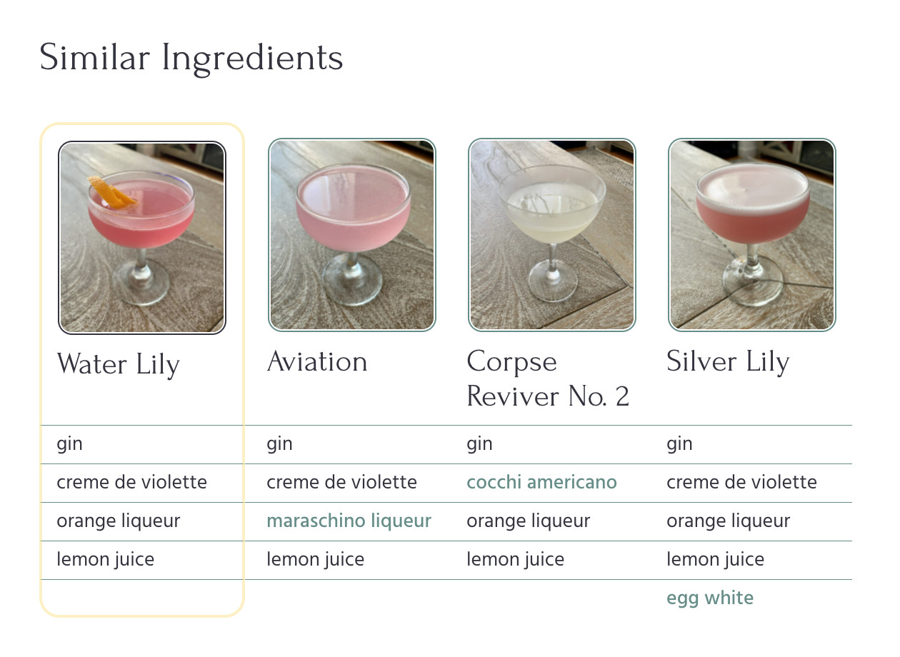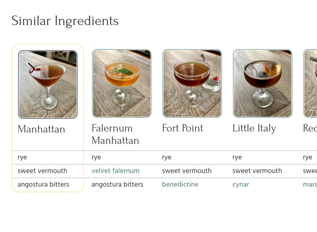 The recommendation algorithm is currently on version two. Version one found the least common ingredient in the cocktail that was also contained in at least one other recipe, and listed out those other recipes as recommendations.