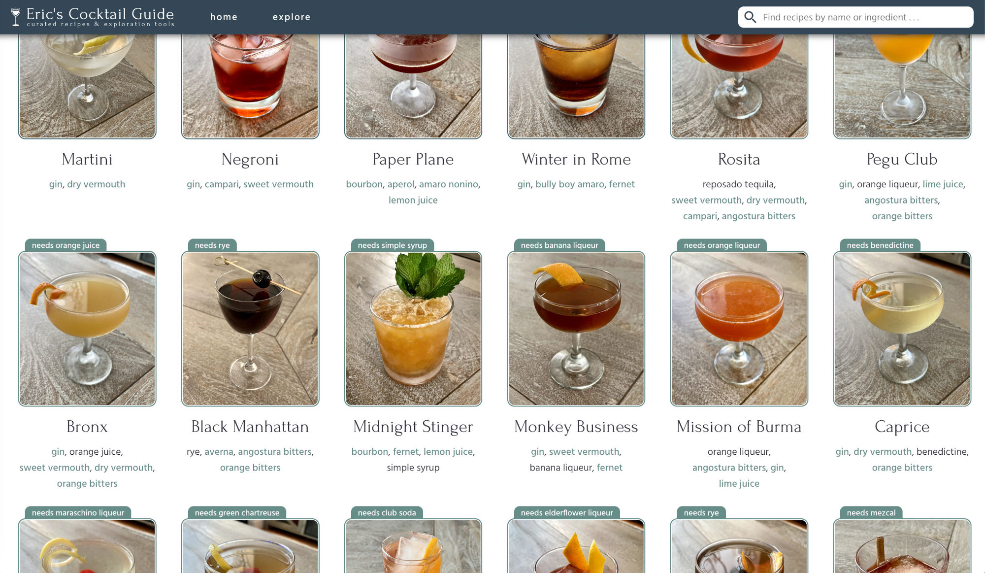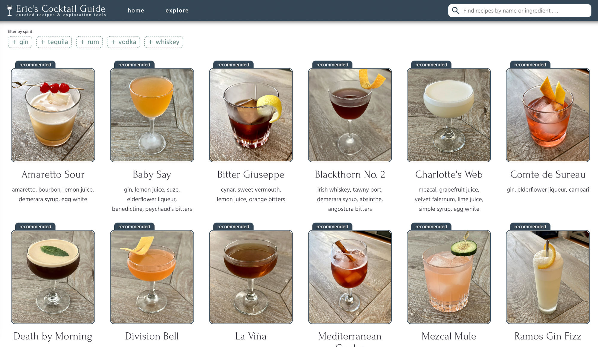 I enjoy making craft cocktails at home. For years, I kept a hand-written drink journal of my favorite recipes, but eventually it became tedious enough to find specific recipes in there that I decided to build a site with full search and filtering capability.