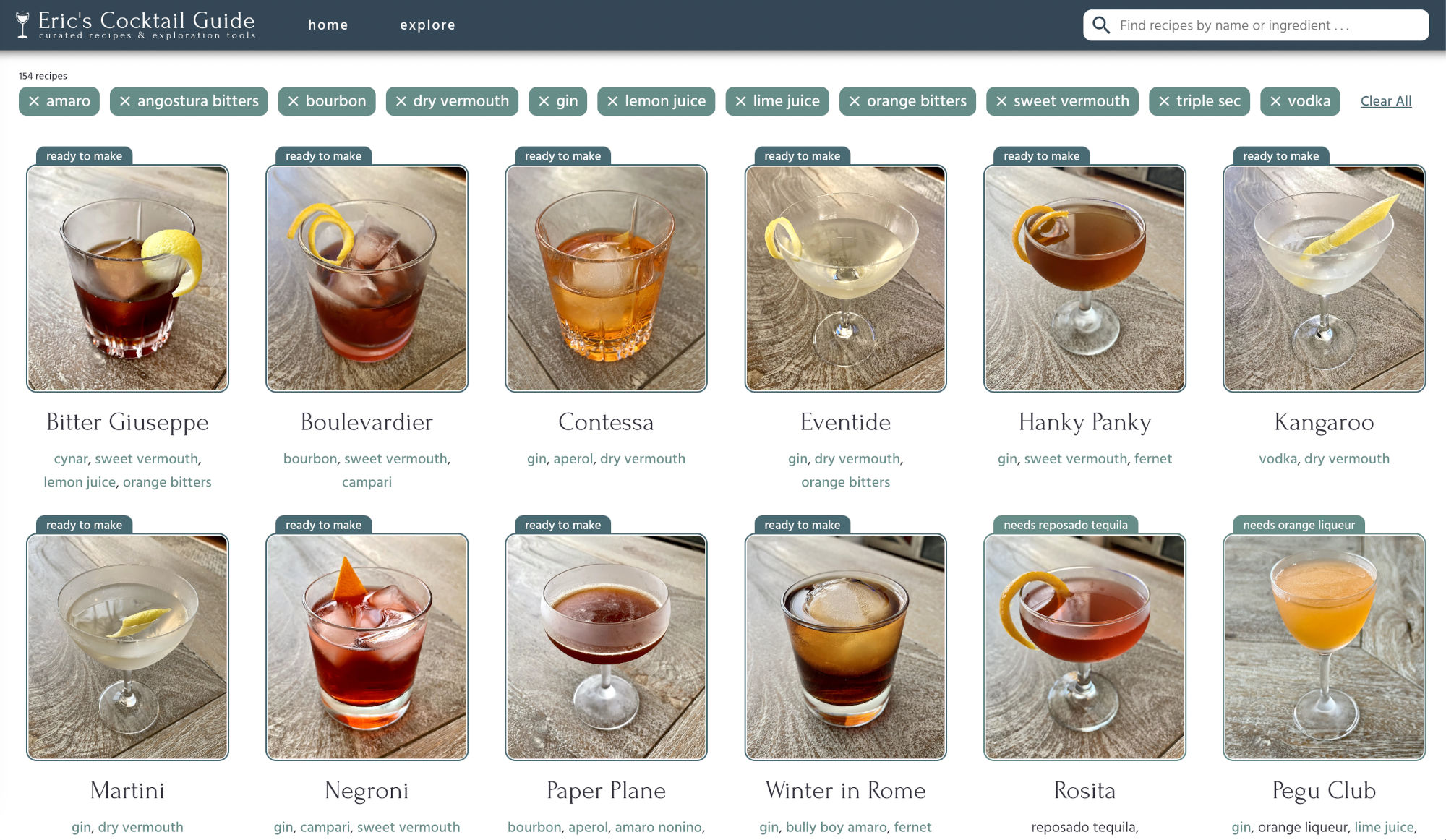 The Explore page is the heart and soul of the site, with the most sophisticated interactivity. It allows you to quickly browse recipes that contain any ingredient you're interested in, as well as put in your entire liquor and fresh ingredients collection to have the site recommend what you can make with what you have. It's still a work in progress, and I have various improvements in mind for the future.
