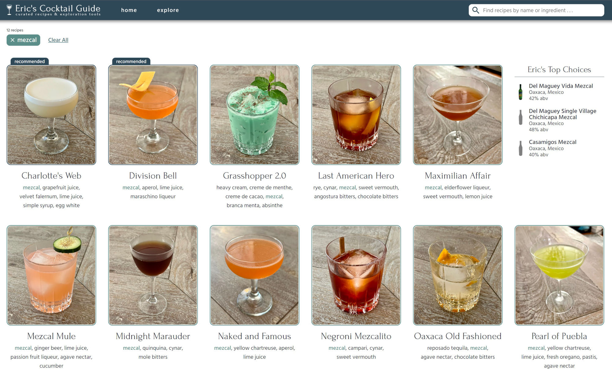 When a single ingredient filter is selected, the Explore page not only shows you recipes containing that ingredient, it also shows you the top brands of that liquor that I use in a section called Eric's Top Choices. The list is ranked by how often I call for a specific brand in my recipes, and is meant as a guide to people branching out into a new spirit or liqueur and wondering which brands to buy. This is a fairly new feature, and I expect to deepen this functionality in the future.