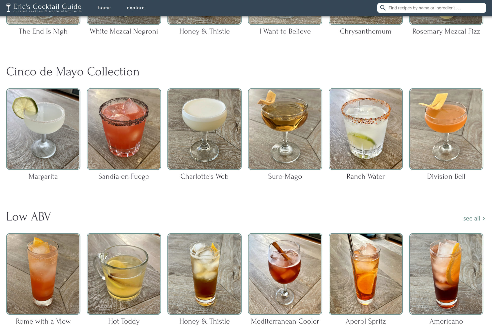 Third in priority on the home page is a carousel of the most recently added cocktail recipes, with a link to see all recipes, sorted by most recent first. This helps returning users (and myself) quickly access the newest recipes.