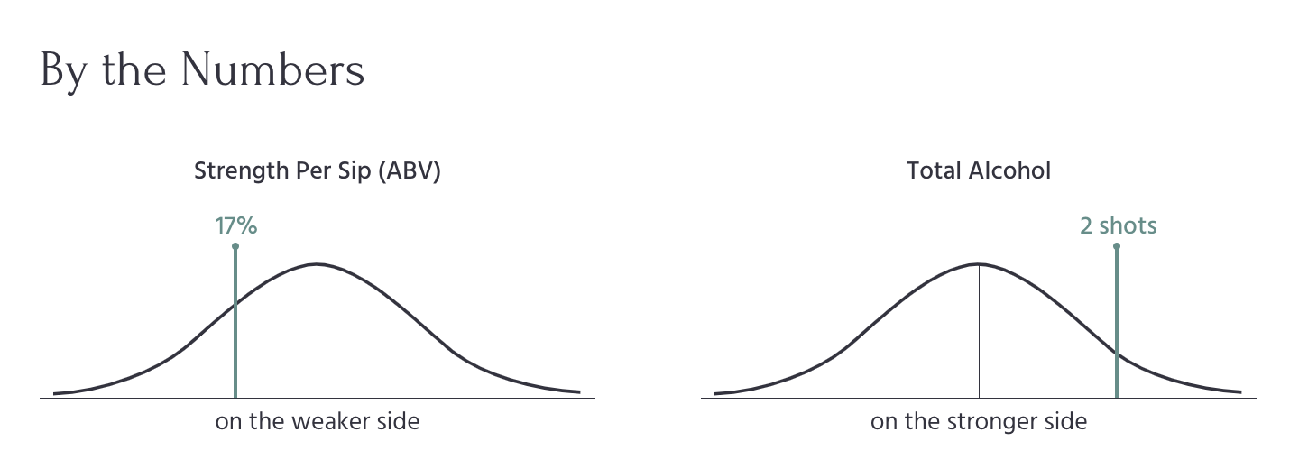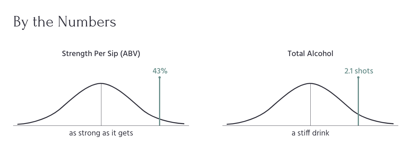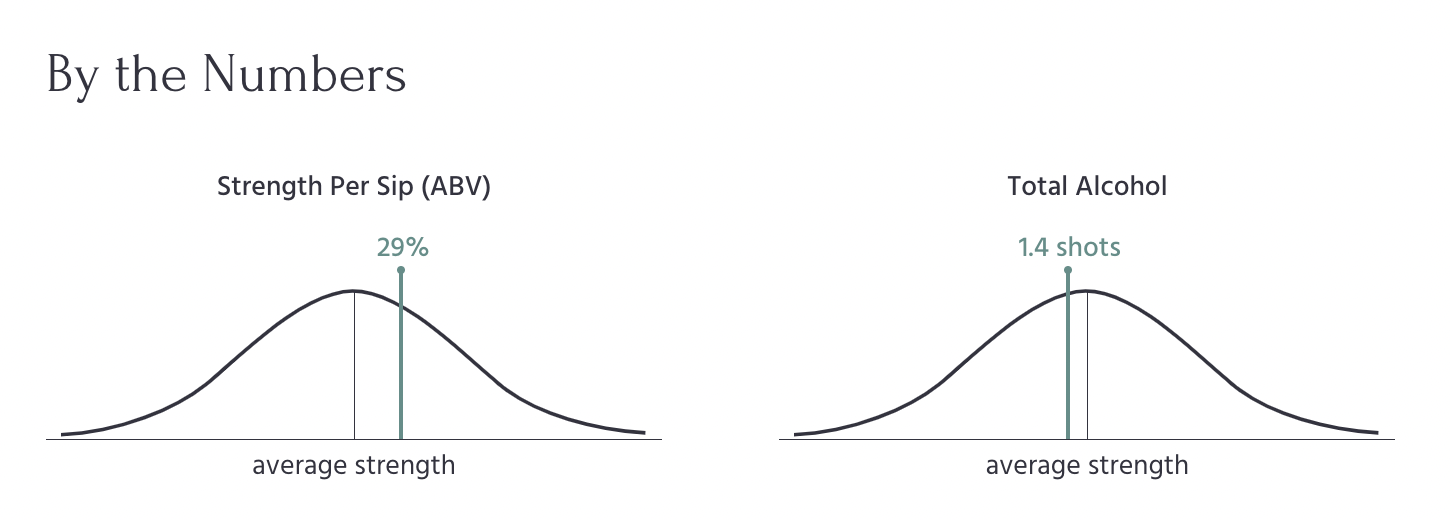 Relative comparison to the universe of cocktails is shown via the line's position on the chart, and reinforced through the text description. Graphing it on a bell curve subtly illuminates that I am using standard deviation calculations to determine which description to use.